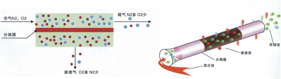 膜分離制氮機(jī)技術(shù)是根據(jù)空氣中的氮?dú)夂脱鯕庠谀蓚?cè)壓差作用下,在膜中的溶解度和擴(kuò)散系數(shù)不同而實(shí)現(xiàn)分離的,滲透率快的水蒸汽、氧氣等一些氣體先透過(guò)膜,成為富氧氣體,而滲透率較慢的氮?dú)鈩t滯留富集,成為干燥的富氮?dú)怏w,達(dá)到氧氮分離的目的。
